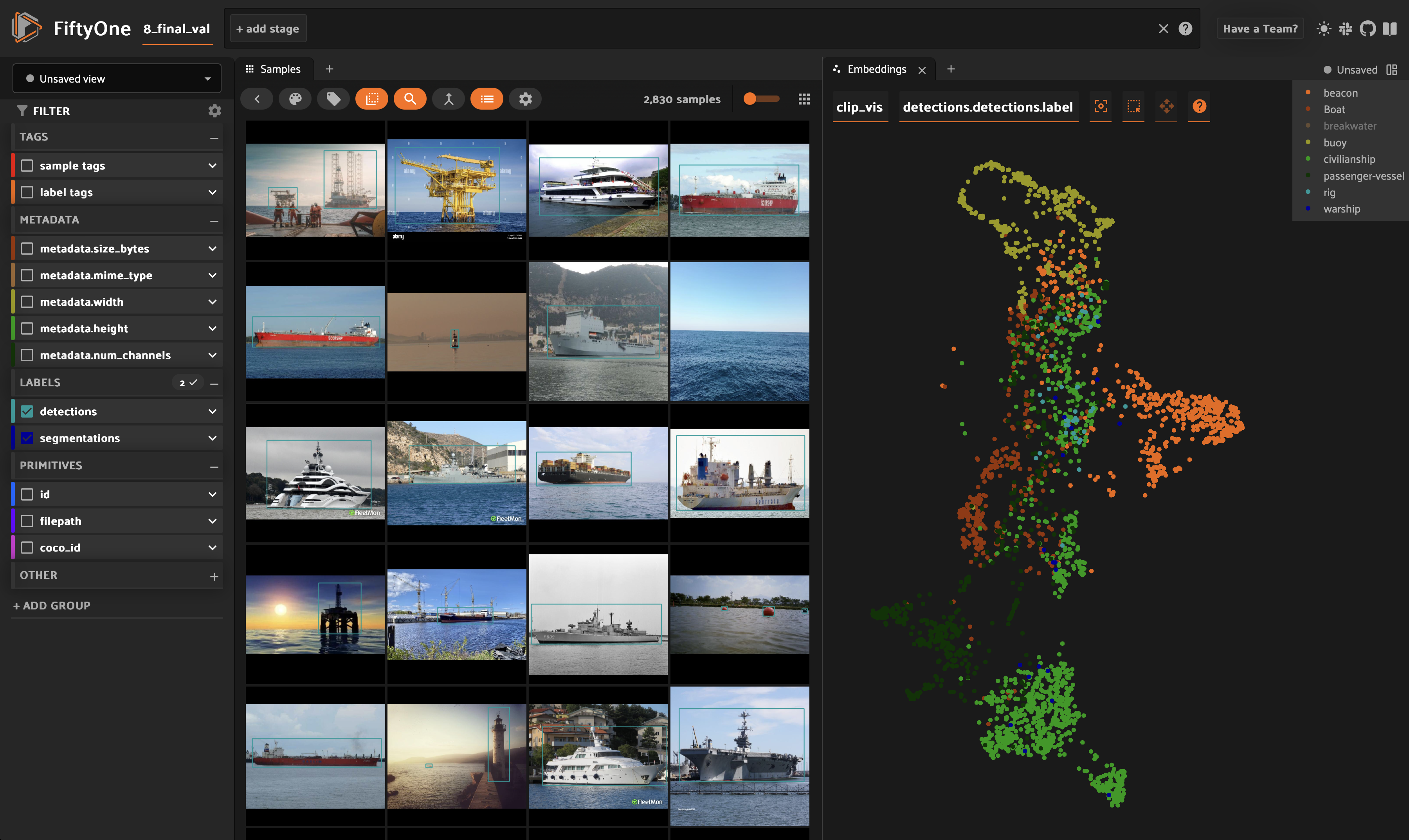 This visualization shows the training dataset after generating embeddings and reducing dimensions. Each point represents a boat image, with similar images positioned closer together.